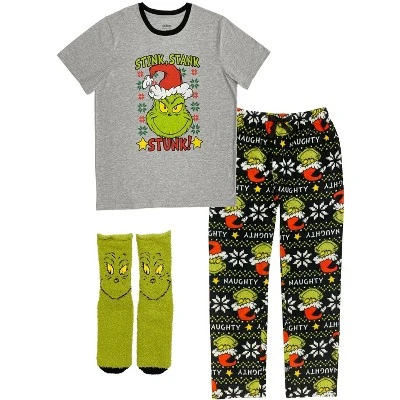 Dr.Seuss and the classic story, How The Grinch Stole Christmas, started as an inspiring children’s tale and is now one of the most beloved holidays shows around! This pajama gift set comes with a Grinch character ringer t-shirt sleep top and matching microfleece pants & cozy socks! The tee is 60% cotton/40% polyester and features a high-quality printed design on the front of the Grinch wearing a Santa hat and the saying Stink, Stank, Stunk! The pajama pants are a soft fleece fabric with a cool allover Naughty design. The socks are a super fluffy fabric that is synonymous with the words cozy socks!.