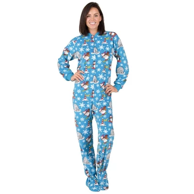 Winter wonders abound in these whimsical feel good footies for men and women! Polar bears ski and penguins snowboard past igloos and the North Pole sign during a blizzard as snowflakes fall with fury! Feel good footed pajamas for plus sizes and all other categories brighten and warm any cold and dreary winter day! Soft and durable polar fleece will bring comfort and last all season long!