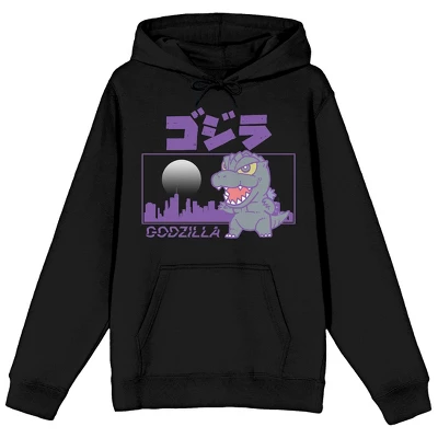 - CUSTOM DESIGN: A chibi Godzilla stomps through the Tokyo skyline in the graphic design on this sweatshirt while purple kanji letters appear above the image. Godzilla fans will love this fun custom design.