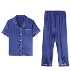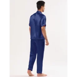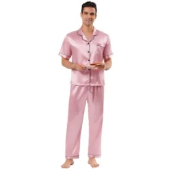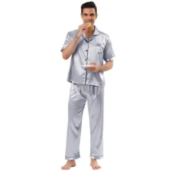 The men’s satin pajama is light with its short sleeves and a notch collar. The classic full button down top makes this pajama easy to take on and off. This short-sleeve top keeps you cool through the hot summer nights. The pajama pants have an elastic waist with straight cut. Suit for home, bath or sleepwear party. The lightweight and soft fabric is easy to skin, which is perfect for stay at home.