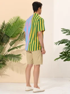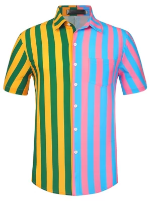 - Contrast color, casual Hawaiian style, button closure, regular fit, summer patchwork vertical striped shirt