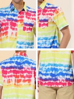 - Tie-dye, color Block, button closure, short sleeve, hawaiian striped shirts