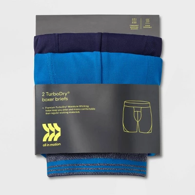 TurboDry moisture-wicking boxer briefs in navy and light blue help keep you drier and more comfortable than regular moisture-wicking fabrics. The pull-on mid-rise style with full elastic waistband makes for comfortable wear, while the recycled polyester fabric is designed to give you a cool feel with full range of motion.