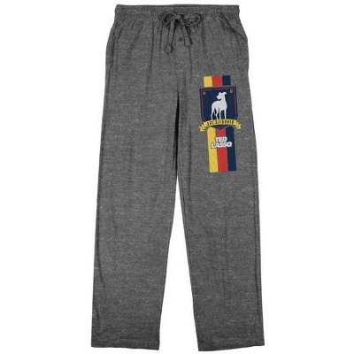 Cheer on your favorite football team in comfort with these Ted Lasso sleep pajama pants. The pants feature the AFC Richmond crest of a greyhound mascot on a navy shield. Yellow, red, and black stripes appear behind the image while yellow letters in front read, “AFC Richmond.” The pants come in graphite heather with an adjustable waistband and a pair of pockets. Fans of the Ted Lasso show will love to support AFC Richmond with these comfy sleep pajama pants.